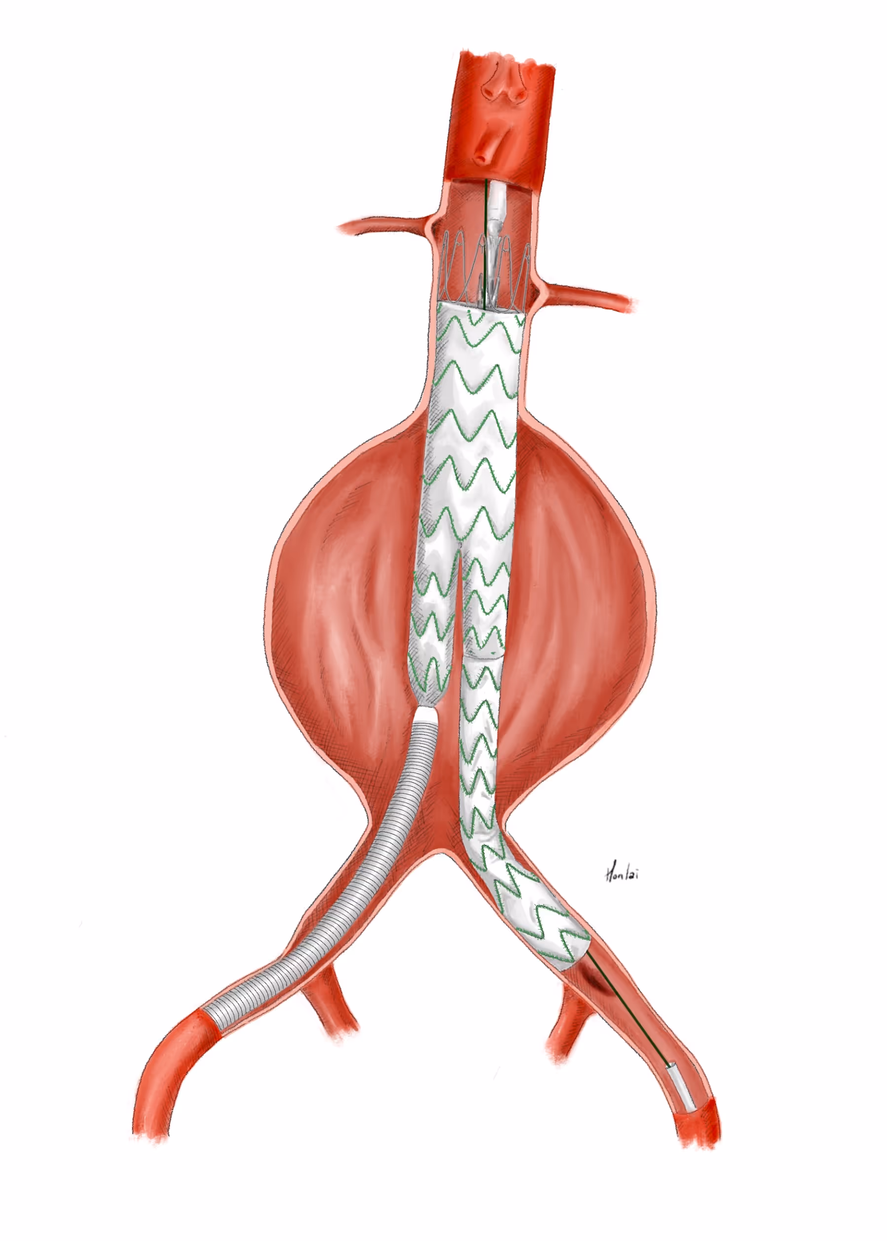 An infrarenal aneurysm,i.e. where there are at least 15mm of non-aneurysmal aorta between the renal arteries and the aneurysm, can usually be treated endovascularly using a standard off-the-shelf stent graft system. However, some additional anatomical conditions must be met for a successful EVAR. These include but are not limited to a cylindrical (as opposed to conical) neck; a neck diameter between 16 and32 (better 28) mm; limited amount of thrombus and calcification in the neck; angulations of the peri- and infrarenal segment within specific limits; a diameter of the aortic bifurcation of at least 16-18mm; iliac arteries that allow the introduction of the delivery systems, are not too kinked and provide adequate sealing zones for the stent grafts.