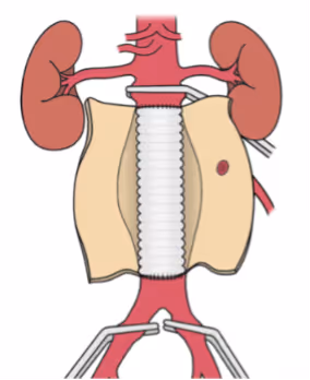 Abdominal aortic aneurysm (AAA) repair with tube graft interposition is a surgical procedure to replace a weakened aortic segment with a synthetic graft. The aneurysm is exposed, clamped, and incised, followed by precise suturing of the graft to the aorta to restore normal blood flow. The procedure ensures durability and prevents rupture, with final checks for hemostasis and graft integration.